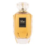 Parfumul “She” este o explozie senzuală de iasomie și citrice în notele sale de top, aducând o prospețime îmbietoare. În mijlocul compoziției, iasomia continuă să domine, însoțită de acorduri solare care adaugă un strop de căldură și strălucire. La baza parfumului, ambră albă și cașmirul aduc o notă catifelată și confortabilă, completată de accente lemnoase care adaugă profunzime și persistență.